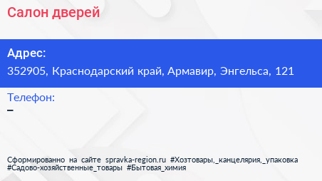 Салон дверей по адресу 352905, Краснодарский край, Армавир, Энгельса, 121 в дальнейшем Организация, размещена в следующих категориях: