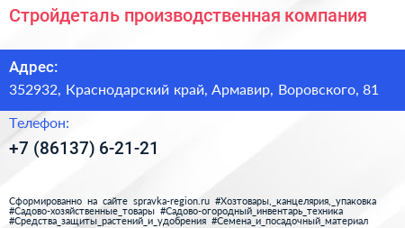 Стройдеталь, производственная компания по адресу 352932, Краснодарский край, Армавир, Воровского, 81 в дальнейшем Организация, размещена в следующих категориях: