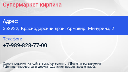 Супермаркет кирпича по адресу 352932, Краснодарский край, Армавир, Мичурина, 2 в дальнейшем Организация, размещена в следующих категориях: