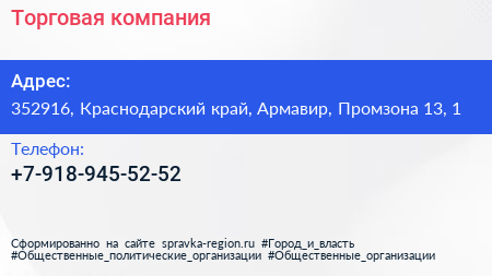 Торговая компания по адресу 352916, Краснодарский край, Армавир, Промзона 13, 1 в дальнейшем Организация, размещена в следующих категориях: