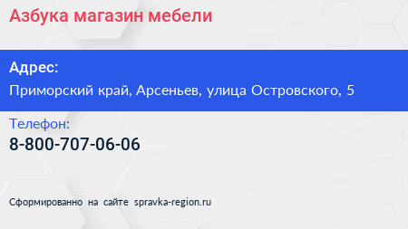 Азбука, магазин мебели по адресу Приморский край, Арсеньев, улица Островского, 5 в дальнейшем Организация, размещена в следующих категориях: