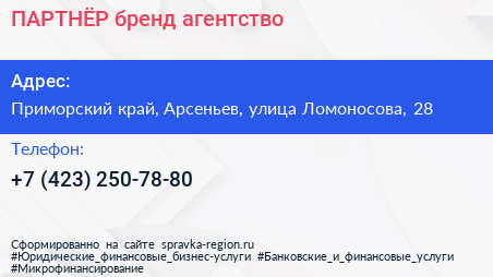 ПАРТНЁР, бренд-агентство по адресу Приморский край, Арсеньев, улица Ломоносова, 28 в дальнейшем Организация, размещена в следующих категориях:
