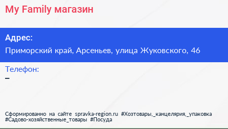 My Family, магазин по адресу Приморский край, Арсеньев, улица Жуковского, 46 в дальнейшем Организация, размещена в следующих категориях: