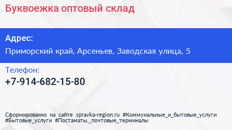 Буквоежка, оптовый склад по адресу Приморский край, Арсеньев, Заводская улица, 5 в дальнейшем Организация, размещена в следующих категориях: