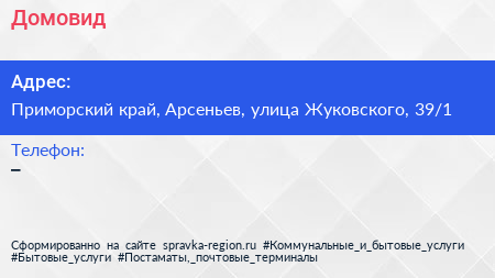 Домовид по адресу Приморский край, Арсеньев, улица Жуковского, 39/1 в дальнейшем Организация, размещена в следующих категориях: