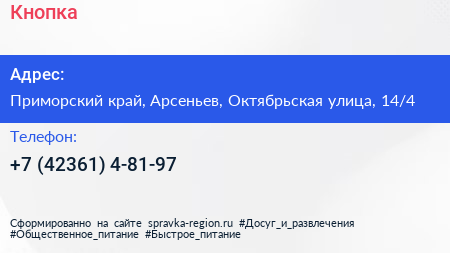 Кнопка по адресу Приморский край, Арсеньев, Октябрьская улица, 14/4 в дальнейшем Организация, размещена в следующих категориях: