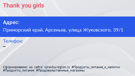 Thank you girls по адресу Приморский край, Арсеньев, улица Жуковского, 39/1 в дальнейшем Организация, размещена в следующих категориях: