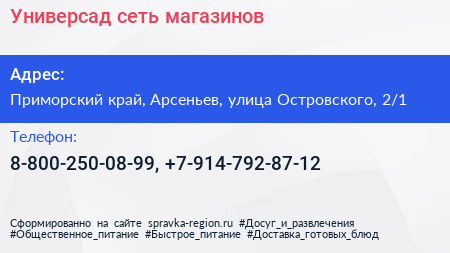 Универсад, сеть магазинов по адресу Приморский край, Арсеньев, улица Островского, 2/1 в дальнейшем Организация, размещена в следующих категориях: