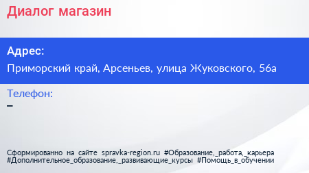 Диалог, магазин по адресу Приморский край, Арсеньев, улица Жуковского, 56а в дальнейшем Организация, размещена в следующих категориях: