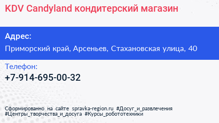KDV Candyland, кондитерский магазин по адресу Приморский край, Арсеньев, Стахановская улица, 40 в дальнейшем Организация, размещена в следующих категориях: