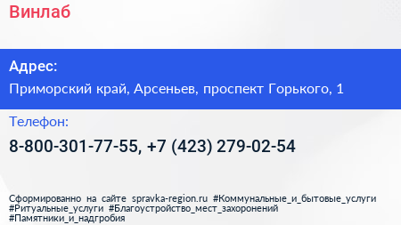 Винлаб по адресу Приморский край, Арсеньев, проспект Горького, 1 в дальнейшем Организация, размещена в следующих категориях:
