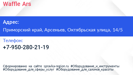 Waffle Ars по адресу Приморский край, Арсеньев, Октябрьская улица, 14/5 в дальнейшем Организация, размещена в следующих категориях: