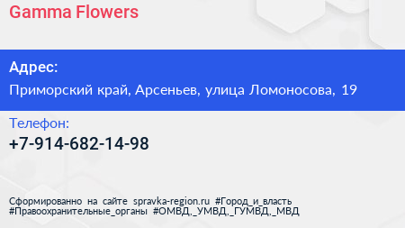 Gamma Flowers по адресу Приморский край, Арсеньев, улица Ломоносова, 19 в дальнейшем Организация, размещена в следующих категориях: