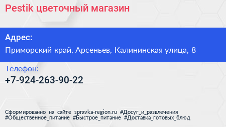 Pestik, цветочный магазин по адресу Приморский край, Арсеньев, Калининская улица, 8 в дальнейшем Организация, размещена в следующих категориях: