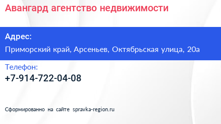Авангард, агентство недвижимости по адресу Приморский край, Арсеньев, Октябрьская улица, 20а в дальнейшем Организация, размещена в следующих категориях: