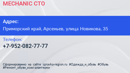 MECHANIC, СТО по адресу Приморский край, Арсеньев, улица Новикова, 35 в дальнейшем Организация, размещена в следующих категориях: