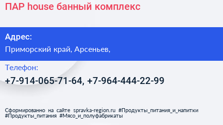ПАР-house, банный комплекс по адресу Приморский край, Арсеньев, в дальнейшем Организация, размещена в следующих категориях: