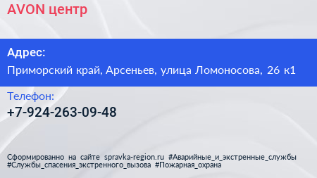 AVON, центр по адресу Приморский край, Арсеньев, улица Ломоносова, 26 к1 в дальнейшем Организация, размещена в следующих категориях:
