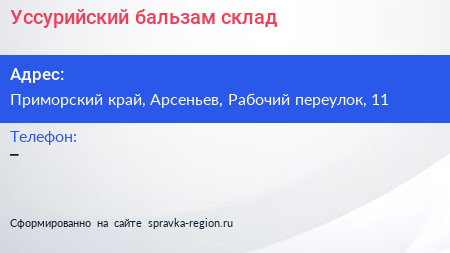 Уссурийский бальзам, склад по адресу Приморский край, Арсеньев, Рабочий переулок, 11 в дальнейшем Организация, размещена в следующих категориях: