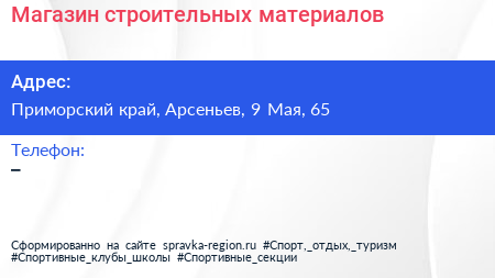 Магазин строительных материалов по адресу Приморский край, Арсеньев, 9 Мая, 65 в дальнейшем Организация, размещена в следующих категориях: