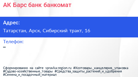 АК Барс банк, банкомат по адресу Татарстан, Арск, Сибирский тракт, 16 в дальнейшем Организация, размещена в следующих категориях: