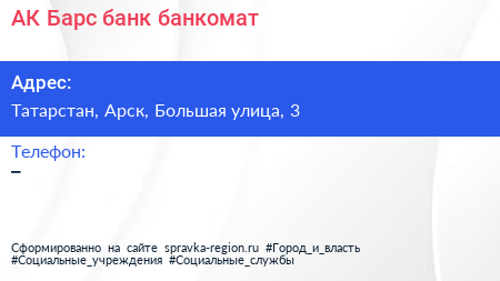 АК Барс банк, банкомат по адресу Татарстан, Арск, Большая улица, 3 в дальнейшем Организация, размещена в следующих категориях: