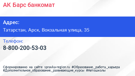 АК Барс, банкомат по адресу Татарстан, Арск, Вокзальная улица, 35 в дальнейшем Организация, размещена в следующих категориях: