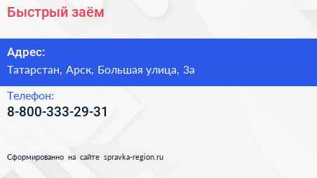 Быстрый заём по адресу Татарстан, Арск, Большая улица, 3а в дальнейшем Организация, размещена в следующих категориях: