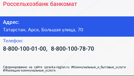 Россельхозбанк, банкомат по адресу Татарстан, Арск, Большая улица, 70 в дальнейшем Организация, размещена в следующих категориях: