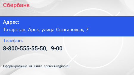 Сбербанк по адресу Татарстан, Арск, улица Сызгановых, 7 в дальнейшем Организация, размещена в следующих категориях: