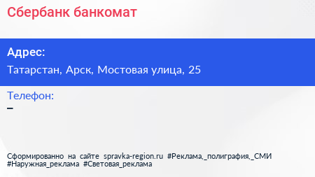 Сбербанк, банкомат по адресу Татарстан, Арск, Мостовая улица, 25 в дальнейшем Организация, размещена в следующих категориях: