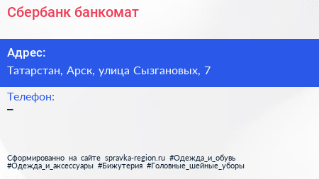 Сбербанк, банкомат по адресу Татарстан, Арск, улица Сызгановых, 7 в дальнейшем Организация, размещена в следующих категориях: