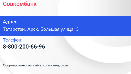 Совкомбанк по адресу Татарстан, Арск, Большая улица, 3 в дальнейшем Организация, размещена в следующих категориях: