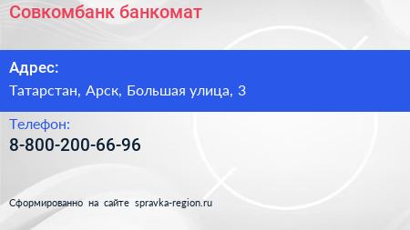 Совкомбанк, банкомат по адресу Татарстан, Арск, Большая улица, 3 в дальнейшем Организация, размещена в следующих категориях: