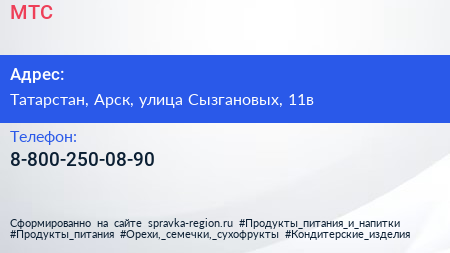 МТС по адресу Татарстан, Арск, улица Сызгановых, 11в в дальнейшем Организация, размещена в следующих категориях: