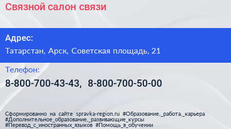 Связной, салон связи по адресу Татарстан, Арск, Советская площадь, 21 в дальнейшем Организация, размещена в следующих категориях: