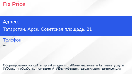 Fix Price по адресу Татарстан, Арск, Советская площадь, 21 в дальнейшем Организация, размещена в следующих категориях: