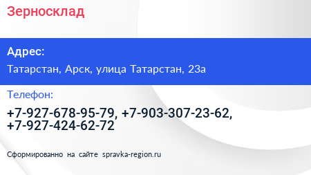 Зерносклад по адресу Татарстан, Арск, улица Татарстан, 23а в дальнейшем Организация, размещена в следующих категориях: