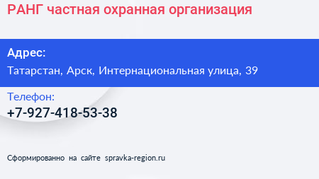 РАНГ, частная охранная организация по адресу Татарстан, Арск, Интернациональная улица, 39 в дальнейшем Организация, размещена в следующих категориях:
