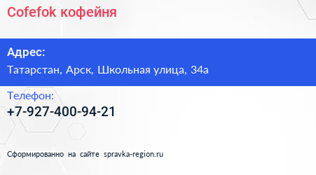 Cofefok, кофейня по адресу Татарстан, Арск, Школьная улица, 34а в дальнейшем Организация, размещена в следующих категориях:
