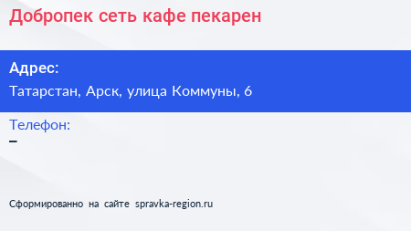 Добропек, сеть кафе-пекарен по адресу Татарстан, Арск, улица Коммуны, 6 в дальнейшем Организация, размещена в следующих категориях:
