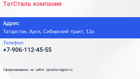 ТатСталь, компания по адресу Татарстан, Арск, Сибирский тракт, 12а в дальнейшем Организация, размещена в следующих категориях: