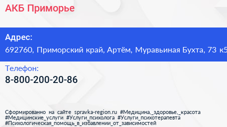 АКБ Приморье по адресу 692760, Приморский край, Артём, Муравьиная Бухта, 73 к5 в дальнейшем Организация, размещена в следующих категориях: