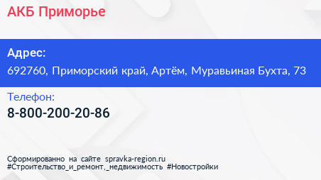 АКБ Приморье по адресу 692760, Приморский край, Артём, Муравьиная Бухта, 73 в дальнейшем Организация, размещена в следующих категориях: