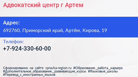 Адвокатский центр, г. Артем по адресу 692760, Приморский край, Артём, Кирова, 19 в дальнейшем Организация, размещена в следующих категориях: