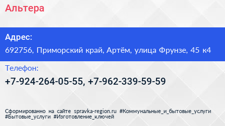 Альтера по адресу 692756, Приморский край, Артём, улица Фрунзе, 45 к4 в дальнейшем Организация, размещена в следующих категориях: