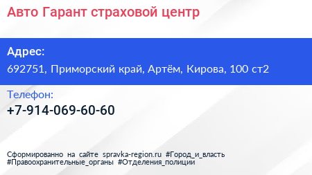 Авто Гарант, страховой центр по адресу 692751, Приморский край, Артём, Кирова, 100 ст2 в дальнейшем Организация, размещена в следующих категориях: