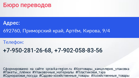 Бюро переводов по адресу 692760, Приморский край, Артём, Кирова, 9/4 в дальнейшем Организация, размещена в следующих категориях: