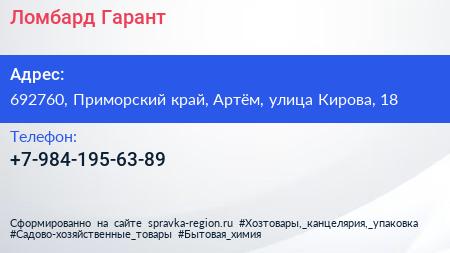 Ломбард Гарант по адресу 692760, Приморский край, Артём, улица Кирова, 18 в дальнейшем Организация, размещена в следующих категориях: