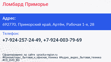 Ломбард Приморье+ по адресу 692770, Приморский край, Артём, Рабочая 1-я, 28 в дальнейшем Организация, размещена в следующих категориях:
